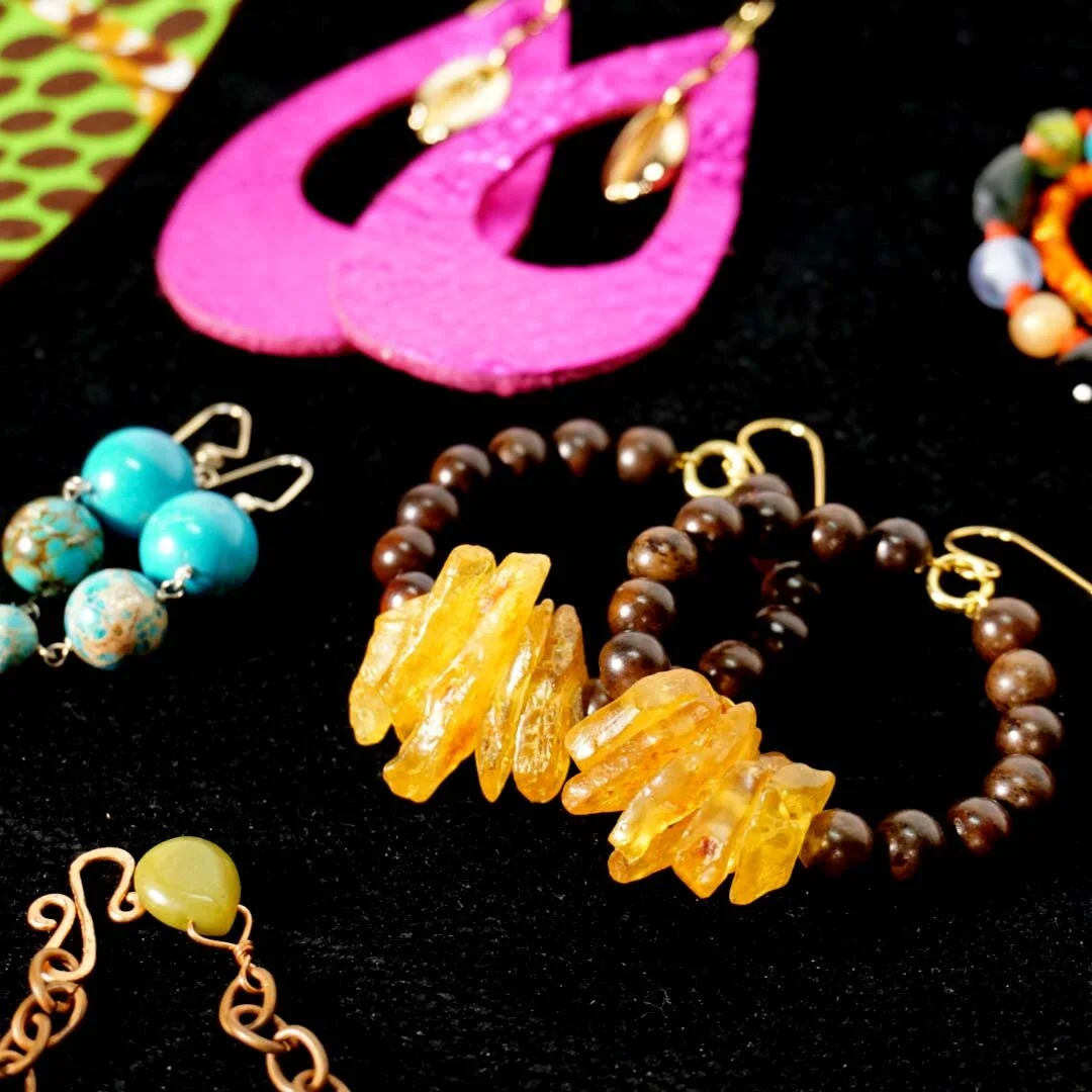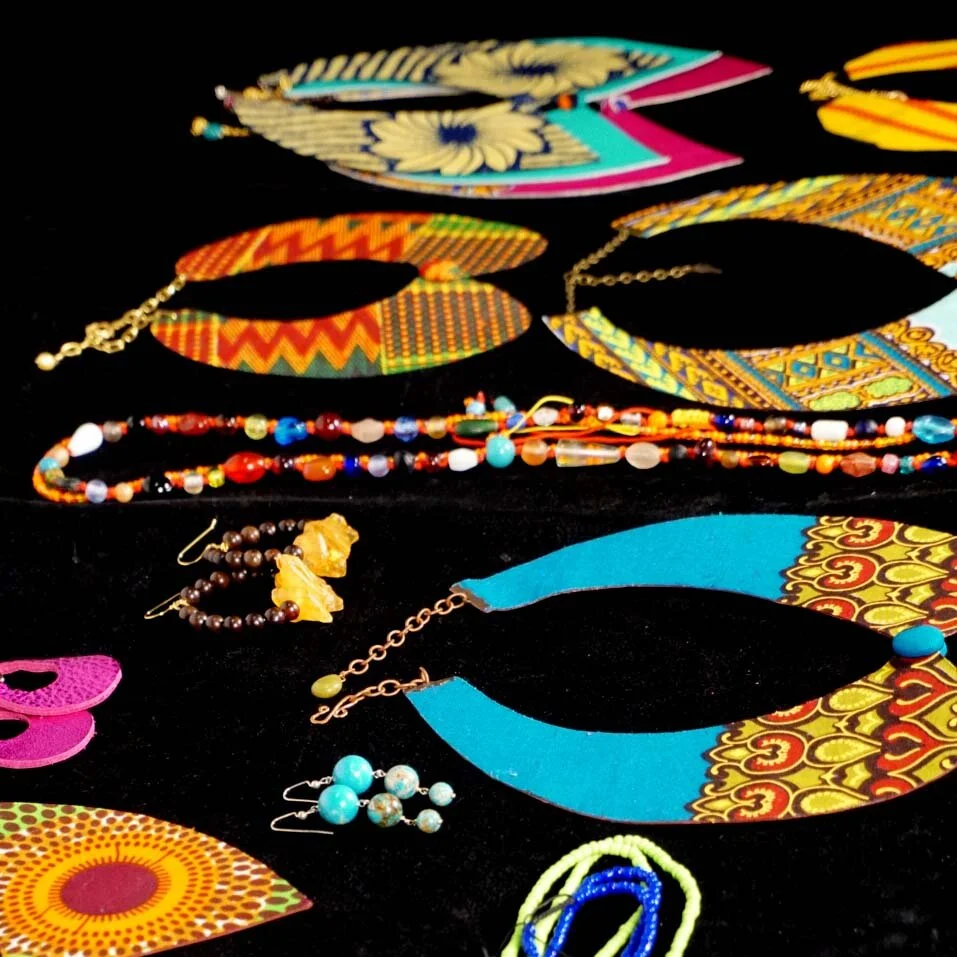 My pieces are made with upcycled and new organic materials. Gemstones, wood, leather and vegan leather, Dutch wax Ankara, and other handmade fabrics. The compositions are meant to evoke and honor an African aesthetic in a modern medium and style. The pieces use symbology, modern and ancient, color and gemstone meaning, to conjure/ awaken certain feelings and emotions for the wearer, and the designs are made to flatter the wearer and profile the beauty of the materials it’s made with. My pieces allow me to allow customized pieces even though no piece is ever the same.